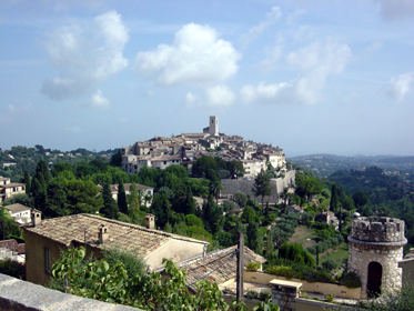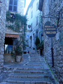 遠くにコート・ダジュールの海を望むサン・ポール村の中心部は、なだらかな丘の上にあり、周囲をぐるりと城壁に囲まれていています。そして城壁の中に入ると、まるで中世にタイムスリップしたかに感じられ、石畳の模様も、立ち並ぶお店もチャーミングです。 |