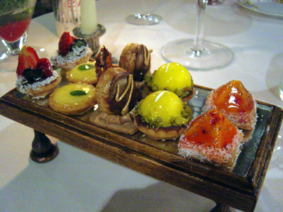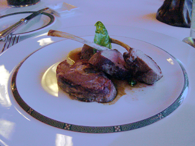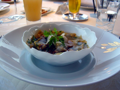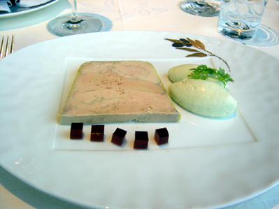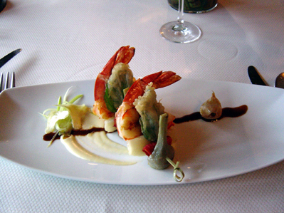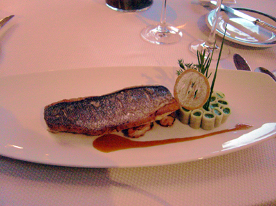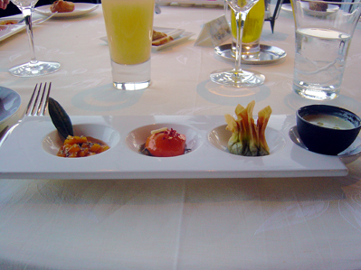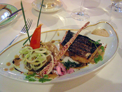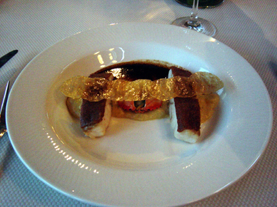 「☆付きレストラン編」のトップはカンヌの近郊、ナプールという町にある、有名なレストラン、「ロアジス」です。ここのシェフは、毎日カンヌの市場に魚を買い付けに来て、それが「本日のお勧め」の一皿になります。 ここ「ロアジス」は、ミシュランで「☆☆+エスポワール」このエスポワールというのは、2005年版からなのですが、「☆をもうひとつ取る可能性がある、期待の星」なのだそうです。つまり、☆☆のレストランの中のトップランクになります。 メニューは「トラディション」「地中海」「オリエント」の三部からなっています。オードブルでパパは生の牡蠣のマリネ(トラディションメニューより)を、ママはフォアグラの冷製テリーヌ(地中海メニューから)を、ヒロはエビと夏野菜の”テンプラ”を”ポンズのソース”でいただくというもの(オリエントメニューより)にしました。残念ながらこれらは写真はありません。 メインは、パパはスズキの炭火焼のオマール入り焼きそば”テリヤキソース”添え(オリエント)、ママは、大伊勢海老の”ガランガ”とソーテルヌ風味(オリエント)、ヒロは仔牛のステーキフォアグラのせ(トラディション)といった具合です。 今回何軒か☆付きレストランを訪れましたが、ママの冷製フォアグラと、ヒロの仔牛のフォアグラのせは、料理として一番良かったような気がします。 |