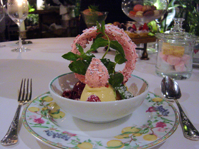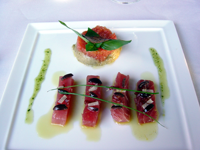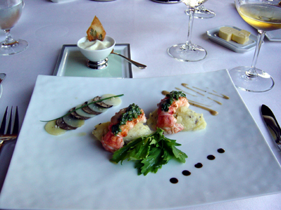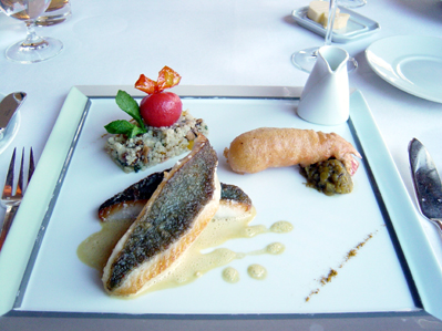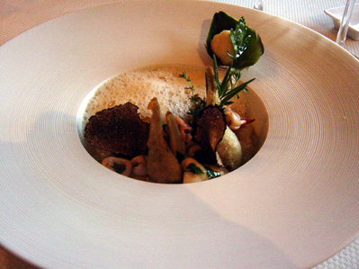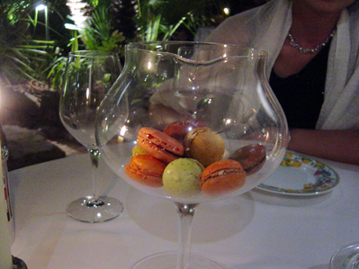 | さて、次のお店はフォーシーズンズ・リゾートのメインレストラン、「ファヴェンティア」です。ここはオープンして1年で、ミシュランの☆をひとつもらうことが出来ました。テラス席でのお食事です。 さすがに☆☆レストランを2軒訪れた後なので、私はここのレストランは実力的には☆ひとつで十分すぎるかと思いましたが、サービスと戸外のプロヴァンス風ロケーション、そしてプロヴァンスを駆ける風が素敵です。シェフは、以前カンヌの北にある有名な☆☆レストラン「ムーラン・ド・ムージャン」のチーフだった方だそうです。盛り付け方はきれいですよね。 |