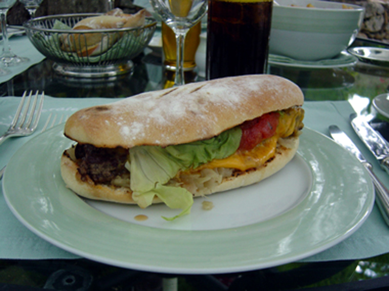 | 昼食の際、ヒロが食べた「チーズバーガー」。肉の焼き加減を聞かれたので「ミディアム」でお願いしました。 一口だけ食べさせてもらいましたが、プールサイドのレストランで、いや、世界中を探してもこれ以上はありえない!と思える至高のハンバーガーです。(恥ずかしながら、それまでは、ハワイの「カハラ・バーガー」とか、フォーシーズンズ・プロヴァンスのハンバーガーはちょっといけるかな?なんて思っていたのです。)ちなみにお値段は4000円超。普通のハンバーガーの2つ分くらいのビッグサイズなのですが、あまりの美味しさにヒロは完食です。次の日もまたオーダーしてしまいました・・・。 |