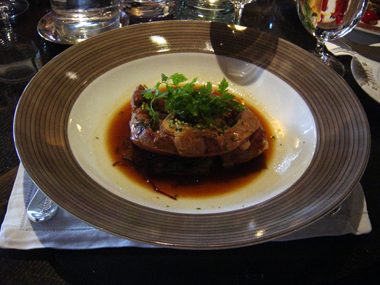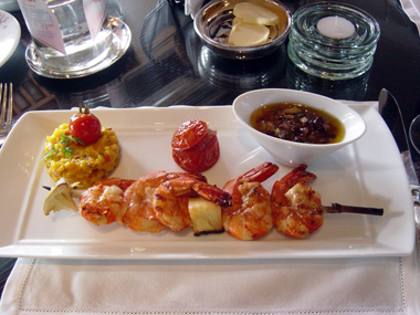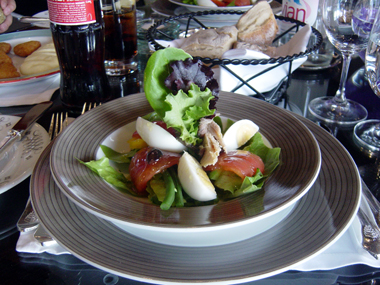 | ある日のお勧めメニュー、えびの串焼きサフラン風味 | ニース風サラダ一人前をパパとママでシェアしました。 | ||